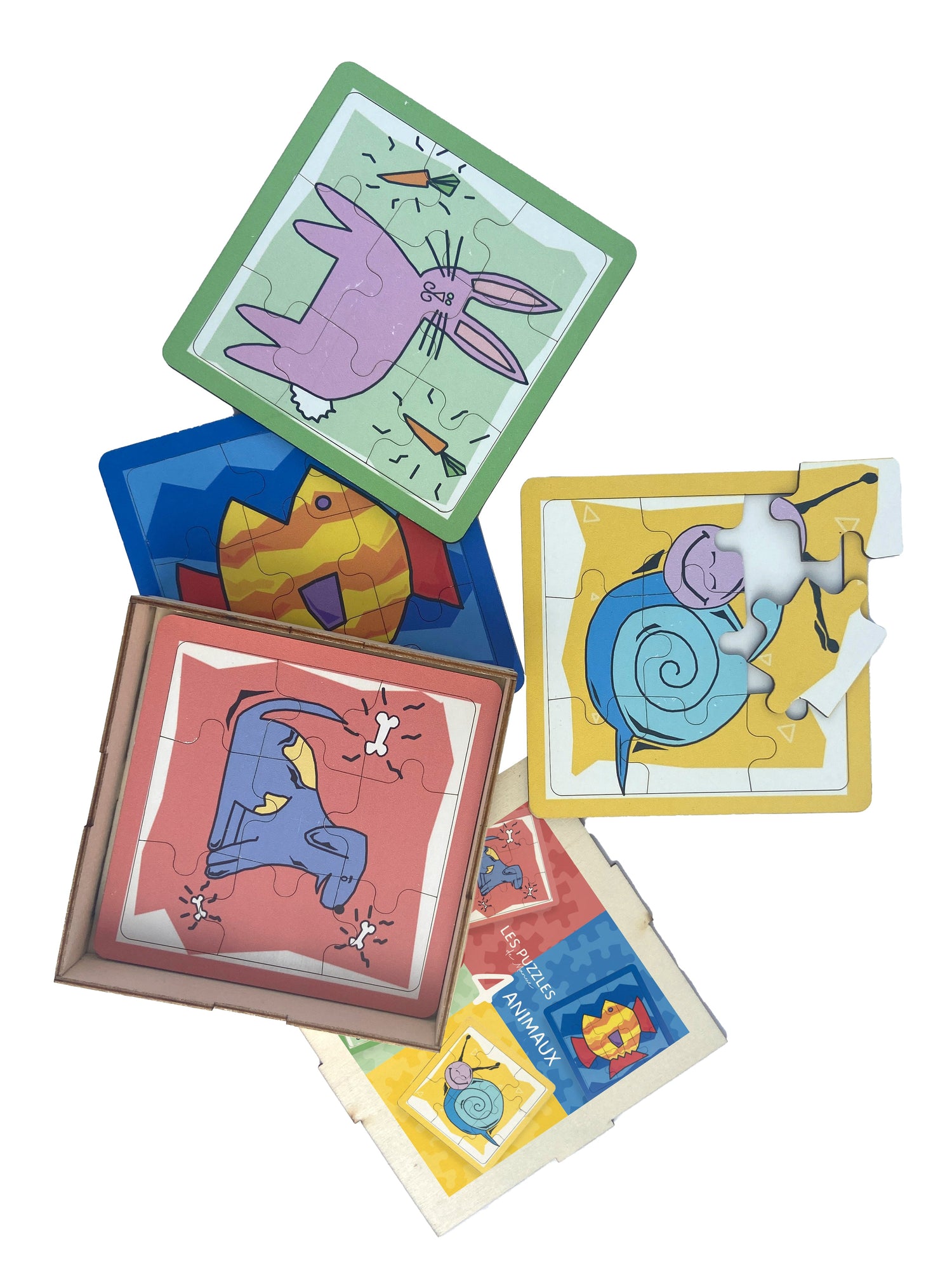 Une série de puzzles en bois réalisés avec les illustrations naïves originales...