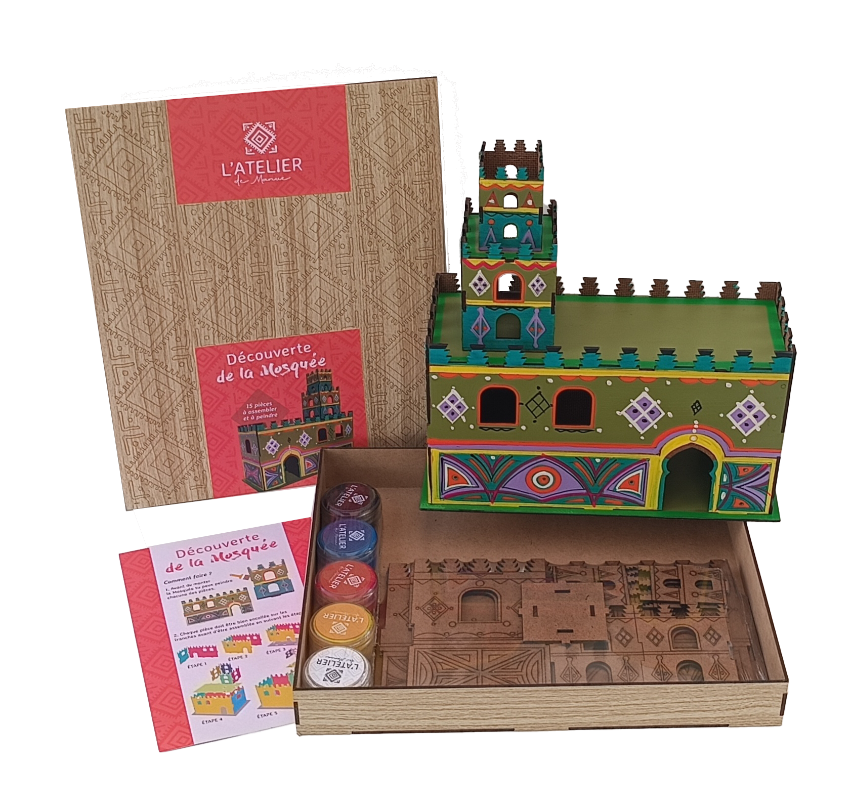 Les Jeux de l’Atelier de Manue sont uniques au Maroc. Des artistes et des artisans contribuent, chacun à leur manière avec leur style et leur vision propre, à enraciner les produits dans une culture et à donner une vraie identité à chaque jeu. Plus qu’un jeu, le « Do It Yourself » permet aux petits comme aux grands d’exprimer leur créativité en réalisant eux-mêmes des objets ludiques qu’ils peuvent personnaliser selon leur inspiration. Nos box sont disponibles en version Kebir ou mini. Chaque boite contient les pièces à assembler, les outils nécessaires et le plan de montage ou la notice technique. Les puzzles 3D Kasbahs, dinosaures ou animaux du Maroc. Les box techniques. Des techniques à découvrir en s’amusant, celle du henné ou des tampons-mousse à appliquer sur toutes sortes de support.