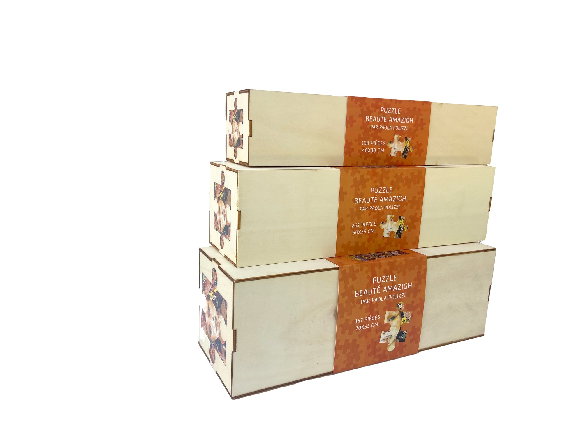Une série de puzzles en bois réalisés avec les illustrations naïves originales d’artistes locaux -Jemick, Paola Polizzi, Hasna Njima – des dessins humoristiques de Riri et des affiches vintage du Maroc.